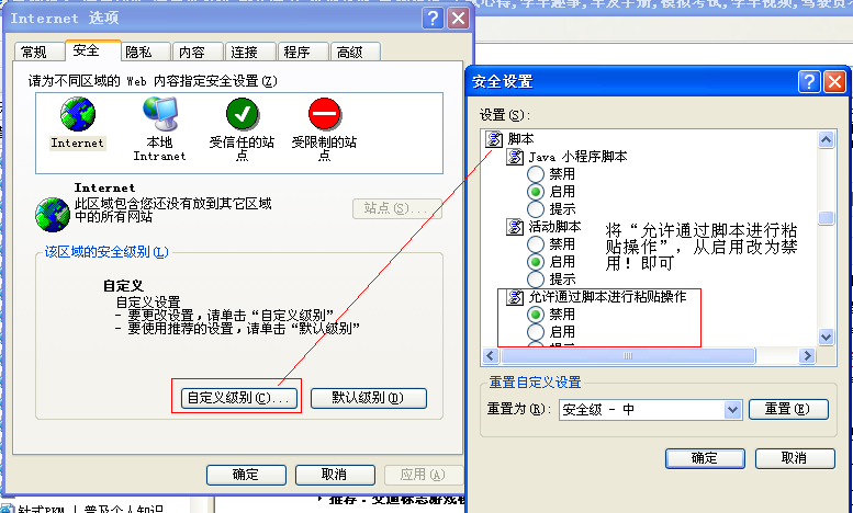 此方法最简单,经此设置后,CSDN、Jsyks等网站均能正常复制了。 将“允许通过脚本进行粘贴操作”,从启用改为禁用!即可。如图: a.进入IE的Internet 选项,选择安全选项卡的“Internet”区域 b.点“自定义级别” c.在安全设置的对话框中,找到“允许通过脚本进行粘贴操作”,从启用改为禁用!