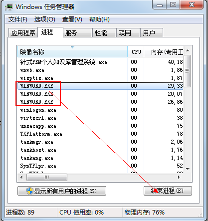 1.2 通过任务管理器,关闭所有的WinWord.exe进程,如下图:
