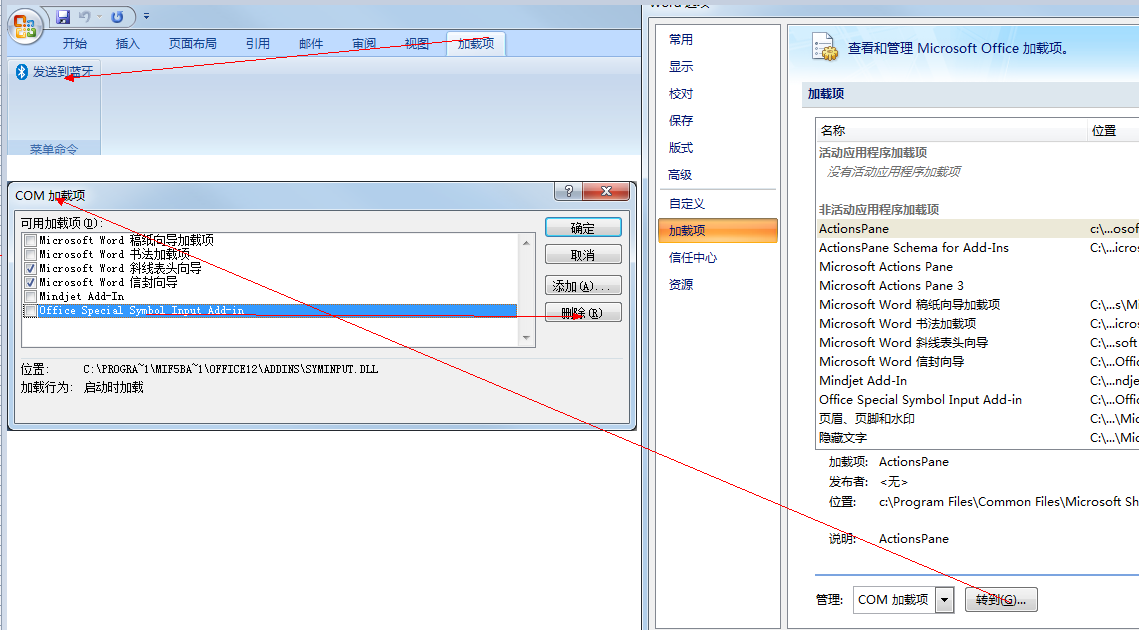 2.3 进入Word选项,如下图,删除有异常的加载项,如intel Send to 蓝牙